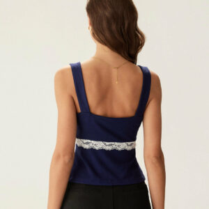 Featuring a flattering square neckline and delicate lace detailing, this cami top adds a touch of femininity to any outfit. The rich navy hue enhances its timeless appeal, while the lightweight fabric ensures all-day comfort. Perfect for layering or wearing on its own, it pairs effortlessly with jeans, skirts, or tailored pants for a chic and versatile look.